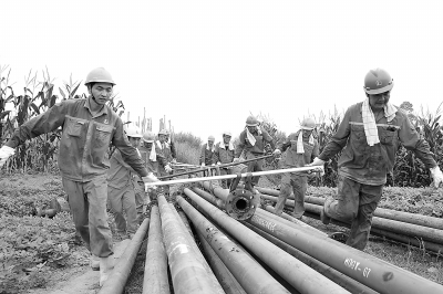 连日来,华北石油工程公司70137HB钻井队克服高温天气施工困难,落实防暑降温保障措施,完成重庆页岩气206H1-1井施工任务,并对钻井设施和放喷管线拆卸回收。图为员工拆卸回收管线。 张 均 摄