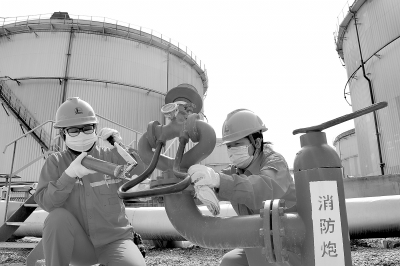 连日来,西北油田塔河油区持续高温天气。该油田油气运销部强化原油、液化气储罐现场管理,加强罐温、压力等参数的监控,定期对消防、喷淋降温系统检查测试,制定应急预案,进行消防演练,对设备设施进行隐患排查,确保储罐安稳度夏。图为7月4日,油气运销部雅克拉末站罐区班员工检查消防炮。邵根林 摄 柯发昌 文