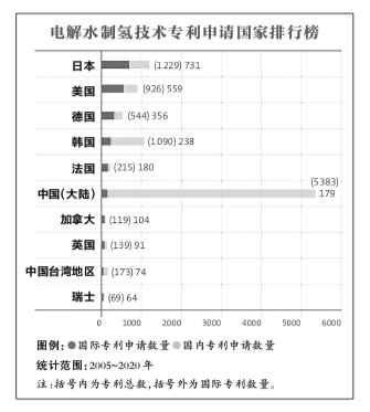 2017年,电解水制氢相关专利申请数量超过化石燃料制氢,此后,天然气制氢相关专利数量逐年减少。这说明当前氢能技术研发的重点已转向电解水制氢。这是由于电解水制氢使用的是可再生能源生产的电力,比非可再生能源制氢能耗更低。 电解水制氢相关专利数量增长主要来自中国,中国申请人主要关注国内市场,中国申请的相关专利中仅3%为国际专利。从专利申请总数来看,排在中国之后的依次是日本、韩国、美国、德国和法国。欧盟此前推出了氢能发展战略,将绿氢作为发展的重点,欧洲国家专利申请数量也居于前列。 从国际专利申请数量来看,日本国际专利数量排在首位,之后为美国和德国,这3个国家2005~2020年电解水制氢专利申请数量占国际专利申请总数的52%。中国虽然专注于国内市场,但是近年来国际专利申请数量逐年增加,而日本的国际专利申请数量有所减少,特别是近两年减少的势头更明显。2018~2020年,日本申请的国际专利数量逐年减少,而中国的国际专利申请数量在3年间增长了38%。