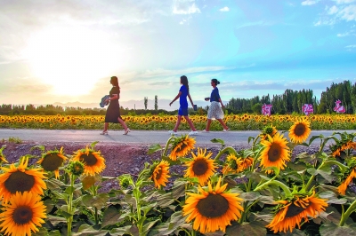 (2022.7.12)村里的阳光女孩走在赏花路上。两旁的向日葵向阳开放,绽放夏日芳华。