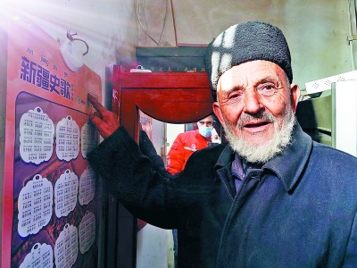 (2021.12.4)“浩浩中华,九州五方。各族奋进,共话情长。”82岁的村民司马义·依明兴致勃勃地展示着《新疆史歌》有声挂画。他一边按着开关,一边入神地听着。中华史、新疆史,都在这幅画里徐徐展开。