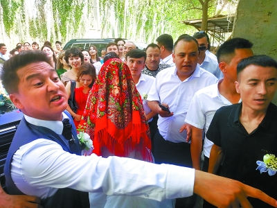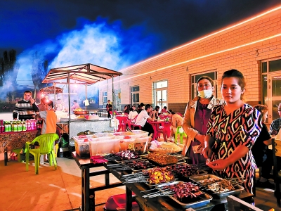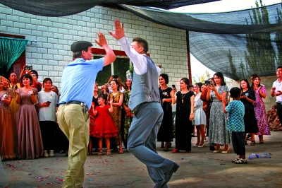 图1:(2022.7.5)在维吾尔族村民家里,父子关系相对严肃,很少开玩笑,或同桌喝酒。但是在一些喜庆场合,父子间会放松一下,像兄弟朋友一样,对舞一曲,赢得亲朋好友的阵阵喝彩。 图2:(2022.4.25)乡里大巴扎新开的夜市,成为村民聚餐休闲的好去处。这里不仅有烧烤啤酒,还有特色歌舞,夜生活一直持续到深夜,每个摊位也获得不菲的收入。 图3:(2022.7.3)新疆乡村的婚礼独具韵味,亲朋好友欢聚一堂,热闹非凡。 图4:(2021.9.3)驻村工作队员入户排查,为推进厕所革命、改善人居环境掌握第一手资料。