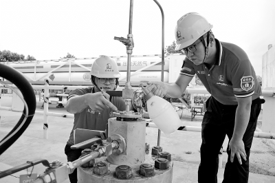 日前,安徽合肥石油通过“听、看、闻、摸、测”等方式,开展加气站防泄漏专项排查,重点排查加气机、安全阀、压力表、阀门与管线接头等容易泄漏部位,确保夏季加气站安全平稳运营。图为7月17日,金湖大道CNG站员工认真检查储气井法兰与安全阀接口。孙德荣 摄
