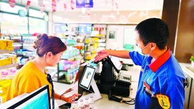 近日,贵州黔南石油在所辖131座加油站易捷便利店开通支付宝“刷脸支付”,客户只需对准设备进行面部识别,5秒即可完成付款,既方便又安全。图为客户“刷脸支付”结算。陈童花 摄