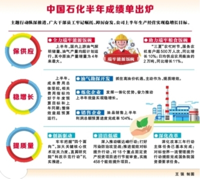 本报记者 符 慧 中国石化半年成绩单出炉:主题行动纵深推进,广大干部员工牢记嘱托、踔厉奋发,推动公司上半年生产经营实现稳增长目标。 这是来之不易的稳增长。今年以来,百年未有之大变局加速演进,我国经济发展的内外部环境更趋复杂严峻,需求收缩、供给冲击、预期转弱“三重压力”持续显现,国内疫情反弹等超预期因素冲击增加,为公司疫情防控和生产经营带来前所未有的压力。 面对严峻复杂的形势和挑战,集团公司党组坚决贯彻落实习近平总书记视察胜利油田重要指示精神,牢牢把握其中的深刻内涵和实践要求,以高质量开展主题行动为总抓手,服从服务发展大局,争创更好经营业绩,以优异成绩迎接党的二十大胜利召开。 保供应 加大油气勘探开发力度,保障经济社会发展,将能源饭碗牢牢端在自己手中 6月中旬,西北大漠深处再次传来喜讯,顺北油气田在8号断裂带上打出第三口千吨井,展示了该断裂带亿吨级的资源潜力,展现了中国石化全力扛好保障国家能源安全核心职责的昂扬姿态。 中国石化所属企业牢记习近平总书记殷殷嘱托,扛起“在7个方面再立新功、再创佳绩”的责任担当,结合自身实际,找准贯彻落实的切入点和着力点,研究制定实施细则和具体措施,奋力建设具有强大战略支撑力、强大民生保障力、强大精神感召力的中国石化。 全力端牢能源饭碗,为我国经济社会安全发展提供坚实支撑—— 上半年,中国石化国内上游油气探明储量、油气产量均超计划运行,其中原油产量增量为4年来最大。胜利油田60多年来累计生产原油占我国同期陆上原油产量的1/5,当下正围绕老区增储稳产,加大攻关力度,确保老区产能储备动态保持100万吨的能力,在新征程上再谱新篇。江汉油田推动涪陵页岩气田效益开发,上半年实现411口气井增压开采,累计增气6.42亿立方米;老井综合递减率4.83%,同比下降3.6%。东营原油库迁建工程建设稳步推进。 掌握核心技术,让增储上产更有保障。胜利石油工程公司在胜利油田樊页、牛页、渤页等油区10余口页岩油生产井上,应用地质工程一体化设计思路,收效明显,其中樊页平1井最高日产油171吨,创国内页岩油单井日产最高纪录。 助力端牢粮食饭碗,描绘丰年好图景—— 4月29日,中国石化与农业农村部签署战略合作框架协议,在保障优先用油、实行优惠加油、提供优质服务、助力降本增效和精准帮扶等方面开展合作。在今年“三夏”农忙时节,中国石化服务农机客户超500万人次,同比增长10%;日均供应农用柴油约2万吨,同比增长11%,助力我国夏粮喜获丰收,在历史高位上实现再增产。 放眼广袤田畴,农民耕耘、农机轰鸣,中国石化员工的身影活跃其中,全力保障作业用油。河南石油设立1000多座农机专供加油站,先后送油到田间1300多次、近600吨。江苏石油设立1200多座农机定点加油点,开辟农机加油绿色通道。安徽石油根据全省农作物分布情况,在16个地市设置354座“三夏”用油保供站,优惠供应农用柴油。 稳增长 坚定信心、攻坚克难,争创更好经营业绩,为稳住宏观经济大盘提供有力支撑 翻开中国石化生产经营成绩单:上半年,成本费用总体受控,相关费用指标均好于年度预算目标和上年同期;整体效益超预算运行。 中央企业是国民经济发展的压舱石、主力军。在主题行动开展过程中,中国石化所属企业坚持“稳中求进”总基调,紧盯年度目标任务,统筹抓好跨周期调节,把握好产业链运行节奏,全力打好攻坚创效主动仗,为做好“六稳”工作、落实“六保”任务、稳定宏观经济大盘作出积极贡献。 在油气勘探开发中,抓住高油价机遇,主动作为、提质增效。油田企业按照主题行动重点要求,高质量推进油气增储上产、天然气产供储销体系建设、工程“四提”“五化”、新能源发展等工作。石油工程建设公司以经营效益为导向,持续完善成本管控新模式,1月至5月,累计新签合同额同比增长43.5%。 炼化企业发挥一体化优势,奋力推动上半年效益实现稳增长。炼油结构持续优化,原油采购降本、产品结构调整等各项工作创效明显。化工创效能力增强,上半年合成树脂新产品与专用料比例、合成橡胶高附加值产品比例、合成纤维高附加值产品比例、精细化工高端产品比例分别同比提高1.3个、0.7个、6.5个、1.1个百分点。面对高油价带来的挑战,镇海炼化落实落细主题行动各项措施,坚持防风险全员一体尽责、新老区炼化一体优化、上下游产业一体发展,上半年原油加工量、乙烯产量、营业收入创历史新高,利润继续保持炼化企业第一。金陵石化以高质量推进主题行动助力打赢生产经营主动仗,上半年实现利润超计划进度,营业收入同比增长32%。 面对上海疫情大考,高桥石化、上海赛科等驻沪企业沉着应对,数千名干部员工及承包商、服务商员工驻厂坚守,实现防疫不松劲、生产不停步,在上海“重启”中发挥产业链供应链主导优势,助力下游企业复工复产。 面对需求收缩压力,销售公司统筹全年重点工作和主题行动重点任务,全力承接内部配置资源,稳市创效保供,上半年油气经营总量平稳运行,利润总额预算进度完成率104%。化工销售紧盯市场精准研判,强化产销衔接,助力生产企业优化排产247次,上半年经营总量超时间进度完成。 提质量 坚持创新驱动,持续深化改革,进中提质推动高质量发展,坚定不移打造世界领先企业 沉甸甸的成绩单透出