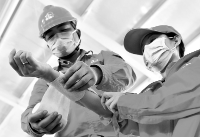 7月25日至27日,中原油田第一届生产单位基层班组长安全技术比武决赛展开角逐。比武涵盖采油、采气等5个专业,实操项目主要有特殊作业隐患排查及措施落实、现场救护、应急处置等。此次比武,进一步增强了班组长“五懂五会五能”能力,带动了基层人才队伍安全技能整体素质的提升。图为7月27日,外伤应急处置项目比赛现场。仝 江 摄