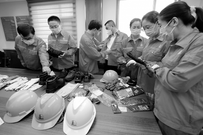 胜利油田海检公司组织劳动保护用品选型会,基层员工自己挑选、现场试穿试戴,最终选出满足安全要求又符合现场实际的劳保用品。图为7月28日,劳动保护用品选型会上,来自基层单位的10余名员工代表正在挑选劳保用品。牟建荣 摄 于 辉 文