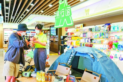 8月15日,中石化易捷首批易行馆在北京龙禹公司太阳宫加油站、浙江杭州石油秋涛路加油站和桐庐瑶琳加油站正式发布。易行馆为满足车友“微度假”需求而产生,通过精心设计的多元化易捷出行箱及“整箱堆头陈列+箱内商品场景”的展示方式,为顾客打造“沉浸式”户外装备消费体验。据悉,今年中石化易捷将在全国10个省(市)规划建设100家易行馆。图为浙江杭州石油秋涛路加油站员工向顾客推荐易行馆内的户外出行商品。龚良奇 摄 冷文贺 文