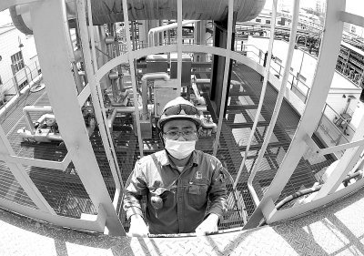 近日,新疆多地突发疫情,塔河炼化全面进行疫情防控部署。面对装置部分人员不能及时到岗的情况,他们号召党员干部带头驻岗坚守,全力保证装置生产稳定运行。图为员工攀爬装置竖梯进行高处巡检。 吴业巍 摄