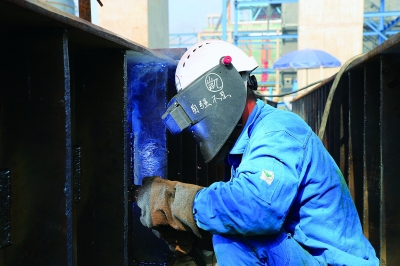 十建公司焊接工人王志凯专注作业,头盔上的“自强不息”四个字十分抢眼。他说,要时刻提醒自己“不怕苦不怕累,工作完成到位,永不松懈”。