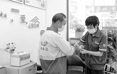 福建石油“爱心驿站”配备小药箱,为户外工作者提供防暑药品、血压测量等服务。图为三伏天里,南平新区加油站员工为环卫工人处理伤口。 谢 丹 摄 林 珊 文