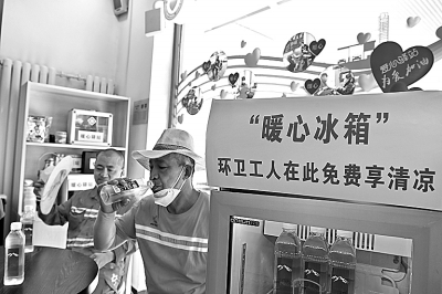 北京石油在加油站设立“暖心冰箱”,为环卫工人免费提供饮用水。图为三伏天里,环卫工人在十里河加油站饮用冰镇矿泉水,消暑纳凉。 本报记者 胡庆明 摄 杨 蕊 文