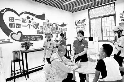 江苏石油“爱心驿站”配置空调、饮水机、小冰箱、图书角等设施,方便外卖骑手、出租车司机歇脚纳凉。图为酷暑天里,在南京万寿加油站“爱心驿站”,外卖骑手利用充电时间喝水休息。本报记者 胡庆明 摄 黄 劲 文