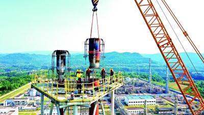 8月17日,西南石油局元坝气田净化厂上空,600吨汽车起重机伸出136米长的吊臂,将2号火炬头平稳地下放到近120米高的平台基座上,标志着中国石化国内上游企业检修中,首次超高空吊装火炬头作业顺利完成。 王 平 摄 袁 鹏 宋 军 文