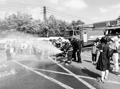 近日,金陵石化消防保卫支队组织开展小学生进“红门”活动,对辖区内街道学校学生开展消防知识宣传,并就如何做好家庭防火和逃生进行培训讲解,提高学生自防自救能力。图为消防员向学生讲解灭火知识。 曾 敏 摄