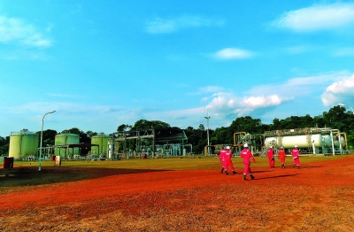 近日,国勘加蓬公司深入开展油藏精细描述和油藏动态分析,有重点地开展了扶躺控躺、气举、油井清蜡防蜡、油井出砂防治、水合物防治、生产设施的维护与检修等工作,促稳产上产。日前,Etame油田新井Eavom-03hst2井完钻投产,获高产油流。图为国勘加蓬公司Tsiengui油田中心处理站。 徐 健 王 磊 段春节 摄影报道