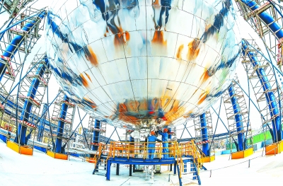 齐鲁石化第二化肥厂员工在CCUS装置4000立方米球罐,调试液位计。曹业琦 摄