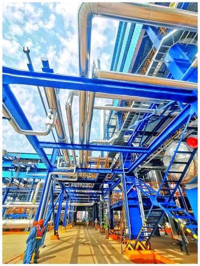 齐鲁石化监护人员对二氧化碳回收装置的尾相施工进行安全监管。 顾 波 摄