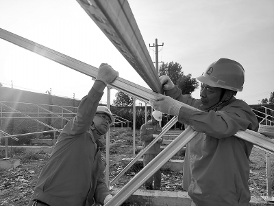 近日,河南油田水电厂开展光伏项目自筹自建工作,预计陆续开工的两个光伏建设项目,9月中旬可全部完工,建成投运后年均发电量为192万千瓦时,平均每年可节约购电费用134万元,减少二氧化碳排放1115吨。图为8月25日,施工人员在安装光伏支架横梁。赵占奎 摄