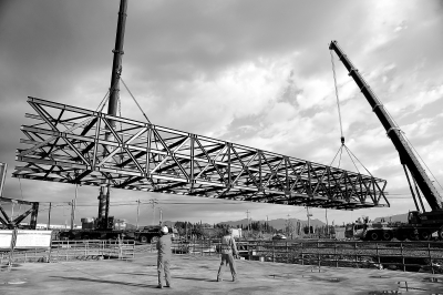 8月19日,新疆库车绿氢示范项目至塔河炼化厂际管廊最大跨度桁架吊装就位,该桁架长约62米,重约135吨,是厂际管廊施工的难点。此桁架顺利吊装就位,为厂际管廊按期中交奠定坚实基础。图为桁架吊装现场。 彭诗琪 摄 曾 悦 文