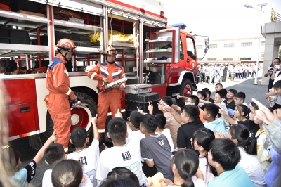 新学期开学之际,中原油田应急救援中心深入辖区及周边学校开展消防安全宣传教育活动。 9月1日,在河南濮阳油田实验学校物探校区,应急救援队员讲解校园防火安全知识,组织在校师生开展消防救援逃生演练,为师生展示抢险救援装备器材。 图为应急救援队员讲解消防救援器材的使用方法。靳红昌 摄