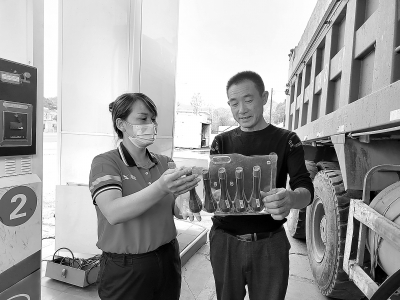 湖北十堰石油强化自有品牌商品销售,大力实施激励措施,6月1日至12月31日持续开展燃油宝销售竞赛,有效提高燃油宝销量。图为9月3日,十堰潘口加油站员工现场推介柴油燃油宝。吴永霞 摄 刘 俊 文