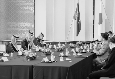 路透社日前公布一项调查显示,沙特10月将大幅下调对亚洲的原油官方售价,因为该地区燃料需求低迷,且来自其他地区的原油出口竞争加剧。据悉,沙特可能将10月运往亚洲的阿拉伯轻质原油官方售价下调4.5美元/桶。炼油商预计,阿拉伯轻质原油10月的官方售价将较阿曼/迪拜原油价格高3.85~6.3美元/桶。 图为沙特外交大臣费萨尔·本·法尔汉亲王(左二)与日本外交大臣林芳正(右二)就稳定原油市场举行会谈。视觉中国 供图