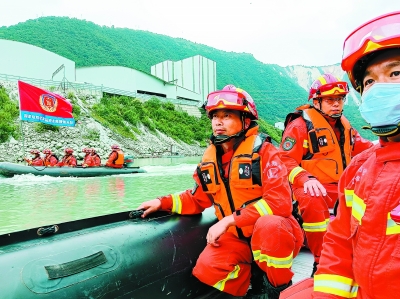 9月7日6时,中原油田普光应急救援中心(国家危险化学品应急救援普光队)队员驾驶两艘冲锋舟,前往四川省雅安市石棉县王岗坪彝族藏族乡跃进村、幸福村等地救援,救出9名被困群众,将其转移至安全地点后,继续驾驶冲锋舟沿大渡河搜救。9月8日一早,该救援队按照命令,在新的救援地点开展工作。 图为9月7日救援队员驾驶两艘冲锋舟沿大渡河搜救。 郝兆璐 摄 施兴峰 文