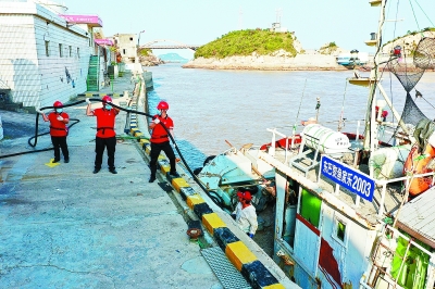 9月16日,历时4个半月的东海休渔期结束。为保障渔民用油,浙江石油各沿海站点提前对发油系统进行调试,备足油品库存,优化人员排班,为渔船提供24小时加油服务。图为台州石油温岭石塘供应站员工正在为渔船加油。陈敏燕 摄 冯晓燕 文