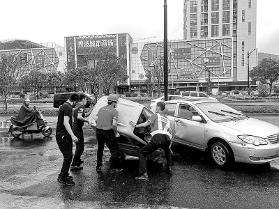 9月13日,浙江杭州石油富阳加油加气站入口,一辆三轮车与一辆小汽车发生碰撞后侧翻在地。加油站工作人员发现后第一时间施以援手,大家齐心协力将三轮车车主从车中救出,并帮忙联系交警到现场处理。图为石化员工扶起侧翻车辆。邵夏楠 摄