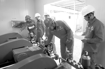 中原油田油气储运中心采油调堵技术服务中心把“质量月”活动和安全隐患排查相融合,查找质量管理薄弱环节和改进方向,开展施工质量管理专项监督检查,进一步提升油田油水井措施施工水平。图为9月20日,该中心质检组在明16调剖点检查聚合物高压混配注入撬装置。 赵奕松 摄 范 明 文