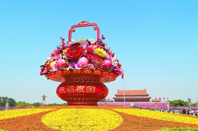 “祝福祖国”巨型花果篮亮相天安门广场。胡庆明 摄