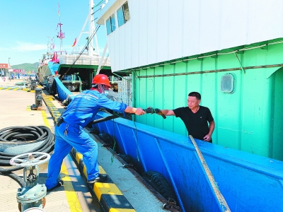 历经4个半月的伏季休渔,渔民在国庆前迎来东海全面开渔的日子。近日,第二十五届中国(象山)开渔节开船仪式在象山石浦港隆重举行。浙江宁波石油全力确保海上各供应站油品充足。为更好地服务渔民,石浦油库和海上网点还建立联动机制,开设绿色通道,24小时全天候值守,确保渔船随到随加,赢得客户满意的同时,实现海上成品油销量快速回升。图为石浦海上供应站员工准备为渔船加油。杨羽念 摄
