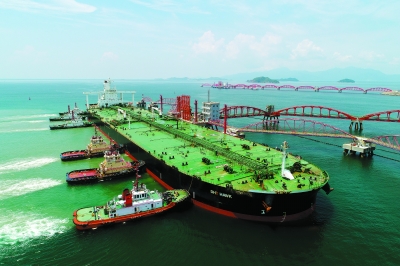 广州石化原油码头自1997年投产至今,累计安全接卸油轮7800余艘,接卸输送原油近2.5亿吨。图为大型油轮靠泊广州石化原油码头。