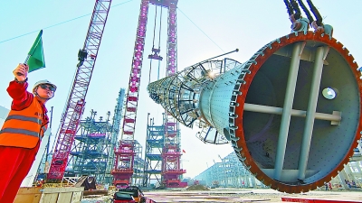 为守护好一江碧水,推进企业转型发展,巴陵石化己内酰胺搬迁项目落地实施,着力打造成世界技术最先进、规模最大的己内酰胺生产基地。图为该项目最重设备吊装场景。彭 展 摄