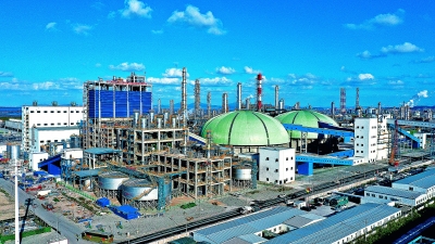 2021年11月19日,镇海基地新建煤焦制氢装置打通全流程,产出合格氢气,从投料开车到产品检验合格,仅用11小时。图为镇海基地煤焦制氢装置全景。