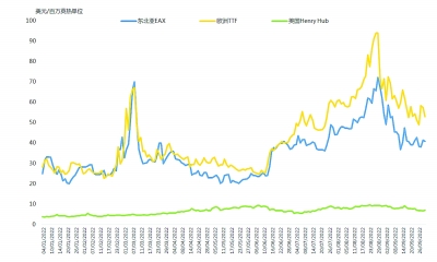 今年以来,国际气价受一系列重大突发事件扰动,呈现大起大落的走势,高低价差达到70美元/百万英热单位以上,欧洲TTF价格引领亚洲价格走势。