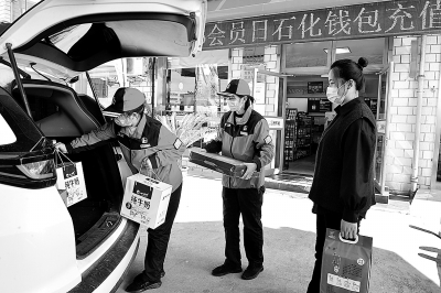易享节活动期间,河南南阳石油精心布置便利店,营造良好氛围,认真服务进店选购顾客,并提供送货上门服务,把商品和服务送到顾客家门口。图为宛城白河加油站便利店员工帮助顾客把商品搬进汽车后备厢。姜明武 摄