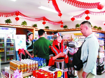 11月以来,广西石油成功建成投运首批6座乡村振兴加油站。该公司积极探索“保供+助农”农村网点发展新模式,与地方协作共建加油站,优先吸纳附近村镇人员就业,带动当地群众增收。图为乡村振兴加油站河池石油大化苏烈加油站便利店内,工作人员为顾客介绍特色商品。 卢 毅 摄 王 强 刘 莹 文