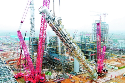 ?11月14日,巴陵石化60万吨/年己内酰胺产业链搬迁与升级转型发展项目净化装置硫化氢浓缩塔,由中石化起运公司安全吊装就位。这是该装置最后一台大件,直径3.6米、高约90米、重450吨。至此,该项目整体大件设备吊装进度达62%。图为硫化氢浓缩塔吊装现场。 李翼骏 摄 彭 展 文