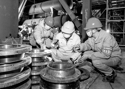 为减少疫情影响,扬子石化炼油结构调整重点工程施工人员挑灯夜战,保障工程进度。炼油项目部督查队党员与施工、监理等安全管理人员一起,严查夜间作业资质,加强重点环节监测预警,为项目建设筑牢安全屏障。图为11月23日,督查队党员与施工安全管理人员共同检查法兰质量。 李树鹏 摄 玉晨雪 文
