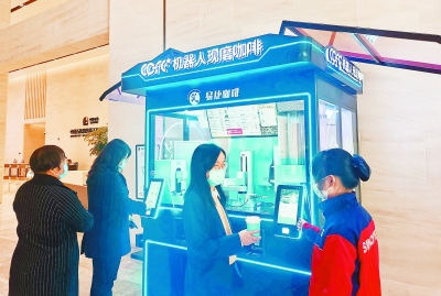 12月13日,中国石化首台易捷咖啡机器人在位于杭州市上城区的浙江石油易捷会员旗舰店投用,可通过全自动设备产出50余种咖啡饮品,从顾客自助下单到制作出杯仅需1分钟,受到消费者青睐。图为顾客购买机器人制作的易捷咖啡。钟 艺 摄 傅奕佳 文