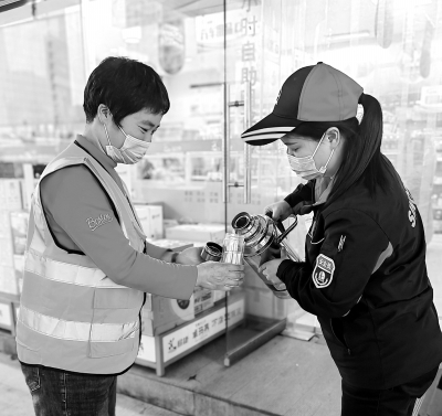 12月9日,贵州贵阳市气温骤降,贵阳石油为环卫工人、外卖小哥等户外劳动者提供室内歇脚的地方,并24小时免费供应热水,切实关心户外劳动者。 图为贵阳石油西门加油站员工为环卫工人添加热水。陈飞飞 摄