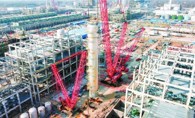 12月17日,巴陵石化年产60万吨己内酰胺产业链搬迁与升级转型发展项目氢氨分部双氧水装置萃取塔,由中石化起运公司安全吊装就位。至此,该项目计划吊装的单台重100吨以上的173台大件设备,已完成吊装132台、占总体比例76%。截至目前,该项目整体完工进度逾86%。图为双氧水装置萃取塔吊装现场。 本报记者 彭 展 摄