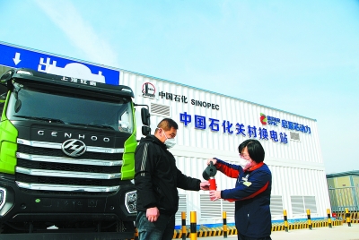 日前,山西首座重卡换电站——山西石油与国家电投启源芯动力合作建设的重卡换电站在长治石油关村加油站投入运营。该站采用顶部吊装式换电结构,有8个电池工位,每天能满足168车次的换电需求。换电站投入运营后,将有效减少重卡燃油消耗、降低污染物排放,对推进交通领域节能减排起到积极作用。图为加油站员工为重卡司机服务。本报记者 秦晓耕 摄 通讯员 曹 方 文