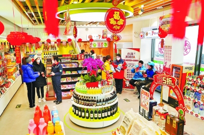 临近春节,北京石油开展以“新春狂欢节”为主题的营销活动,通过贴福字、挂灯笼等方式将易捷便利店装扮一新,并精选美食、酒水等近百款商品进行促销,在让顾客享受到优惠的同时,有力拉动了易捷服务销售额增长。图为1月12日,京教加油站员工向顾客推介年货。本报记者 高 君 摄 于 慧 文