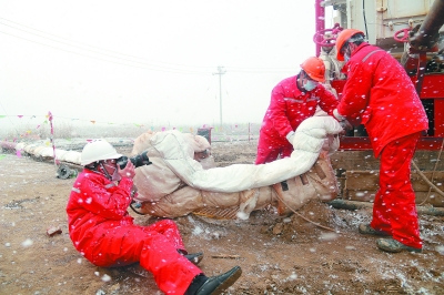 ▲1月23日,大年初二,在胜利油田孤岛D24X29注汽现场,胜利油田记者王国章拍摄值班人员加固注汽管网保温棉。盖振峰 摄