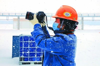 1月12日,新疆库车大雪纷飞。中国石化报社“新春走基层”机动采访组记者彭诗琪在塔河炼化常压焦化装置现场拍摄。 曾 悦 摄