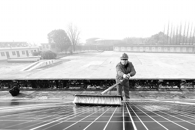 ?春节期间,河南油田水电厂加强巡检维护,对附近住宅区内烟花爆竹燃放后落在光伏板上的炮灰、炮屑,进行及时清理。河南油田11座光伏发电站节日期间共发绿电16万千瓦时,可减少二氧化碳排放量92吨。图为水电厂员工清洁光伏板。 李如飞 摄