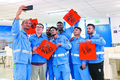 春节期间,炼化工程集团五建公司新加坡炼化一体化工程项目部举办丰富多彩的节庆活动,项目部中外员工一起写福字,在欢乐祥和的氛围中度过中国年。李进学 摄影报道
